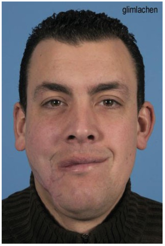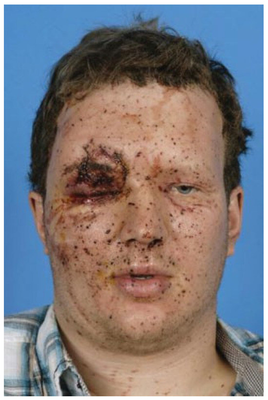 The patient was brought to the intensive care for observation. The patient was discharged in good clinical condition on hospital day 9. He was readmitted on day 14 posttrauma, after developing a wound dehiscence in the right buccal region, with formation of an orofacial fistula. The plastic surgeon closed the defect with a supraclavicular artery island flap 33 days posttrauma. At 16 and 20 months posttrauma, multiple scar corrections were performed, to correct mutilating scars in the face and a trismus. Healing of the fractures was uncomplicated and vision was only slightly affected. Drooping of the right corner of the mouth persisted due to facial nerve injury, but did not bother the patient (