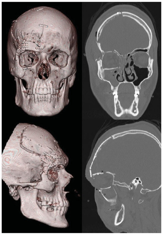 Figure 6). On hospital day 4, the swelling was significantly less and management of the facial fractures was performed. Via a coronal incision, the right frontal sinus was approached. The neurosurgery service performed a craniotomy and closed several dura leaks. Next, the posterior wall of the frontal sinus was removed and the nasofrontal duct obliterated, thereby achieving cranialization of the right frontal sinus. Bone fragments of posterior wall were used for reconstruction of the anterior frontal sinus wall and the defects in the orbital walls (