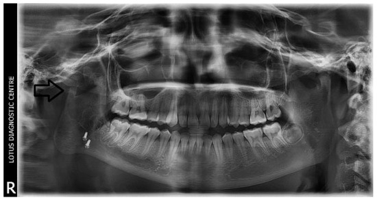 Postoperative OPG at 6 years of follow-up (black arrow depicting CCG graft with temporalis muscle interpositioning with respect to right temporomandibular joint).