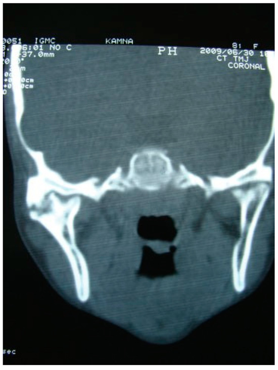 Preoperative coronal CT scan of right temporomandibular joint ankylosis.