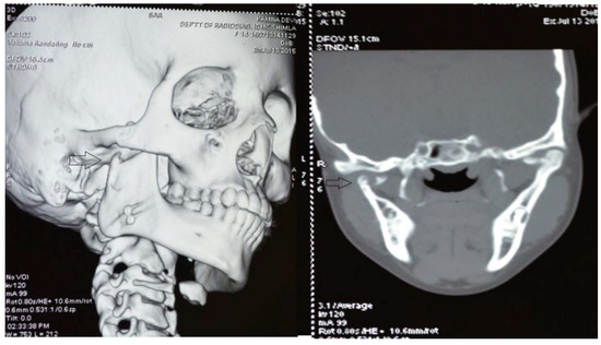 - Long, X.; Li, X.; Cheng, Y.; et al. Preservation of disc for treatment of traumatic temporomandibular joint ankylosis. J Oral Maxillofac Surg 2005, 63, 897–902. [Google Scholar] [PubMed]