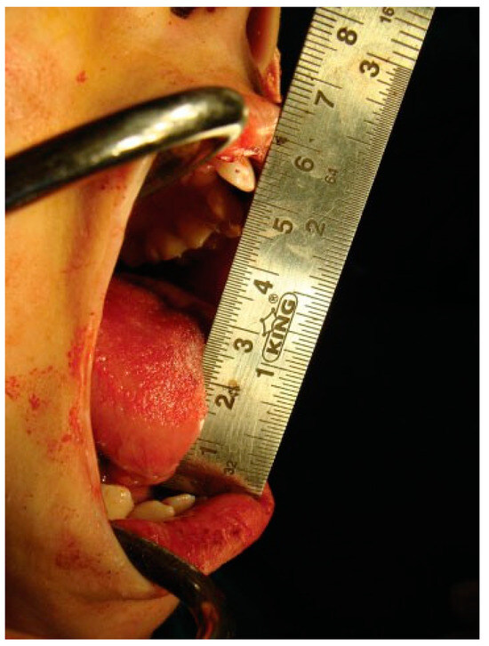 - Kaban, L.B.; Perrott, D.H.; Fisher, K. A protocol for management of temporomandibular joint ankylosis. J Oral Maxillofac Surg 1990, 48, 1145–1151; discussion 1152. [Google Scholar]