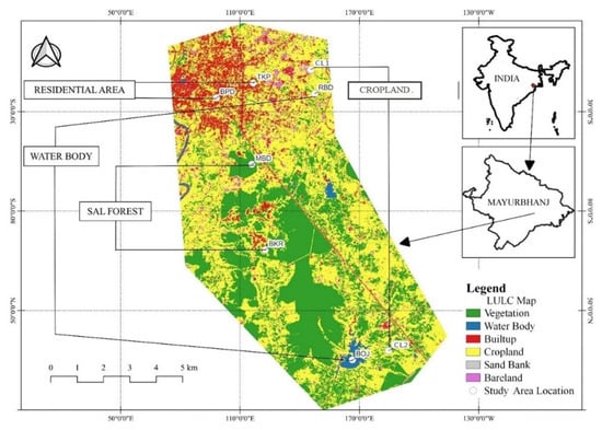 This study was carried out in Baripada, which lies between 21.90°–21.96° N and 86.71°–86.78° E. It is located in the Chotanagpur Plateau Region of Odisha, Eastern India, with an altitude of 45 m a.s.l (Figure 1). It has a tropical climatic condition that experiences an extremely hot and humid summer (45 °C) followed by a humid monsoon (30 °C) and chilling winter (10 °C) with an annual temperature of 30 °C. The winter season is observed between November to February. After that, summer continues from March to June, followed by the monsoon season from July to October, with an annual mean rainfall of 1800 mm. The city area is spread over approximately 30 km2, with a population of 116,874 (Census of India 2011). The study area consists of diverse habitats, such as highly urbanized residential and commercial complexes, agricultural lands, and woodlands. The dominant vegetation in urban and suburban areas include Ficus benghalensis, Ficus religiosa, Magnifera indica, Azadirachta indica, Aegle marmelos, Tamarindus indica, etc. In forest areas, the vegetation is dominated by Shorea robusta, Terminalia bellirica, Cassia fistula, Suzygium cumini, Bombax ceiba, etc. Invasive shrubs such as Chromolaena odorata and Lantana camara are spread in natural vegetation patches as well as urban green spaces. The agricultural lands present in this area are used only once a year to cultivate paddy, i.e., from July to December, and the rest of the year, it remains abandoned. Our study focused on Baripada and its outskirts surrounded by woodlands and agricultural lands with human interference [].