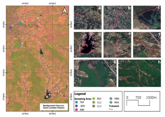 Map showing all eight transects in the study area; red color represents the transect line; (a) TKP = Takatpur, (b) BPD = Baripada, (c) RBD = Rani Bandh, (d) BOJ = Borjhor, (e) CL1 = Cropland1, (f) CL2 = Cropland2, (g) MBD = Manchabandha, (h) BKR = Budhikhamari.