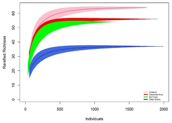 Avian species shared the highest similarities among cropland and residential areas. Many bird species could be found supporting different feeding guilds in these two habitats because of the abundant food sources, accompanied by several insect prey species attracted to the crops [,,]. Residential areas shared the similarity in abundance with cropland, which implies the component of generalist birds in the study area. The mosaic of a variety of tree covers, small water bodies, bamboo grooves, and grasses around cropland areas makes a more productive heterogeneous landscape that allows it to sustain various bird species [,]. However, a comparison between residential areas and forest areas showed that the diversity and richness are higher in residential areas, possibly due to habitat loss in forest areas which forced the bird species to inhibit in residential areas []. It is likely that well-vegetated urbanization provides bird species with refuge, nesting sites, and food sources. Studies have shown that species numbers decline with urbanization, and highly abundant species dominate the remaining species group [,,,]. In monoculture, sal-dominated forest habitats may have low fruit and flowering trees, while residential areas have parks and roadside fruit trees like banyan (F. benghalensis), peepal (F. religiosa), and jamun (Syzygium cumini), etc., in residential areas. Birds’ diversity increased with the increase in natural woodlands; however, their diversity decreased with an increase in commercial monoculture forests []. In our case, we also noticed that bird diversity in sal forest was less than in residential and cropland. Probably, it is due to its dominant monoculture habitat. Likewise, small and isolated forest fragments in urban areas fail to sustain a greater diversity of birds [].