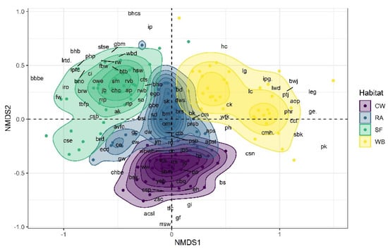 Non-metric Multidimensional Scaling (NMDS) showing the different bird species composition at each habitat (stress = 0.25; Non-metric fit R2 = 0.936; linear fit R2 = 0.695); CL = Cropland, RA = Residential areas, SF = Sal Forest, and WB = Water Body. Where; ap = Alexandrine Parakeet; acsl = Ashy-crowned Sparrow Lark; asp = Ashy Prinia; ak = Asian Koel; aob = Asian Openbill; aps = Asian Palm Swift; ipfc = Indian Paradise-flycatcher; apst = Asian Pied Starling; bm = Bank Myna; bs = Barn Swallow; bw = Baya Weaver; bbs = Bay-backed Shrike; bd = Black Drongo; bhm = Black-headed Munia; bk = Black kite; bwk = Black-winged Kite; bhcs = Black-headed Cuckooshrike; bho = Black-hooded Oriole; bno = Black-naped Oriole; brw = Black-rumped Woodpecker; rp = Rock Pigeon; btb = Blue-throated Barbet; bbbe = Blue-bearded Bee-eater; bq = Common Buttonquail; bst = Brahminy Starling; brd = Bronzed Drongo; bwj = Bronze-winged Jacana; brs = Brown Shrike; bhb = Brown-headed Barbet; ce = Cattle Egret; chbe = Chestnut-headed Bee-eater; cts = Chestnut-tailed Starling; cc = Common Chiffchaff; cct = Common Coot; chc = Common Hawk Cuckoo; ch = Common Hoopoe; ci = Common Iora; ck = Common Kingfisher; cmh = Common Moorhen; cm = Common Myna; csp = Common Sandpiper; csn = Common Snipe; ctb = Common Tailorbird; csb = Coppersmith Barbet; ipg = Indian Pygmy-goose; cse = Crested Serpent Eagle; cw = Citrine Wagtail, Motacilla citreola; dw = Dusky Warbler; rcd = Red Collared Dove; ecd = Eurasian Collared Dove; ego = Eurasian Golden Oriole; fw = Forest Wagtail; fbw = Fulvous-breasted Woodpecker; gc = Greater Coucal; ggbw = Greater Golden-backed Woodpecker; gbe = Green Bee-eater; gbm = Green-billed Malkoha; gw = Grey Wagtail; hc = House Crow; hs = House Sparrow; hsw = House Swift; inj = Indian Nightjar; ph = Indian Pond Heron; iro = Indian Robin; irl = Indian Roller; jc = Jacobin Cuckoo; jb = Jerdon’s Baza; jbb = Jungle Babbler; jm = Jungle Myna; jcs = Large Cuckooshrike; ge = Great Egret; lwd = Lesser Whistling Duck; leg = Little Egret; lg = Little Grebe; omr = Oriental Magpie-Robin; osl = Oriental Sky Lark; owe = Oriental White-eye; pfp = Paddyfield Pipit; ptj = Pheasant-tailed Jacana; pk = Pied Kingfisher; pp = Plain Prinia; php = Plum-headed Parakeet; psb = Purple Sunbird; prsb = Purple-rumped Sunbird; lrtd = Greater Racket-tailed Drongo; rrsw = Red-rumped Swallow; rvb = Red-vented Bulbul; rwb = Red-whiskered Bulbul; rrp = Rose-ringed Parakeet; rs = Rosy Starling; rtp = Rufous Treepie; rw = Rufous Woodpecker; sbm = Scaly-breasted Munia; sk = Shikra; stse = Short-toed Snake Eagle; sd = Spotted Dove; so = Spotted Owlet; sbk = Stork-billed Kingfisher; tbfp = Thick-billed Flowerpecker; tfc = Taiga Flycatcher; avfc = Asian Verditer Flycatcher, Eumyias thalassinus; wbwh = White-breasted Waterhen; wtk = White-throated Kingfisher; ww = White Wagtail; wbd = White-bellied Drongo; wds = Dusky Woodswallow; yeb = Yellow-eyed Babbler; yfgp = Yellow-legged Green Pigeon; zsc = Zitting Cisticola; rwl = Red-wattled Lapwing; lc = Little Cormorant; phr = Purple Heron; jlb = Jerdon’s Leafbird; sm = Scarlet Minivet, Pericrocotus speciosus; gf = Grey Francolin; ip = Indian Pitta; gi = Glossy Ibis.