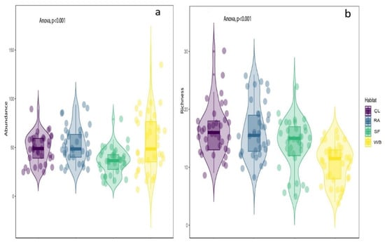 ANOVA showing that there was a significant difference between habitat in terms of bird abundance (a) and richness (b); CL = Cropland, RA = Residential areas, SF = Sal Forest, and WB = Water Body. Check Table 2 for more details.