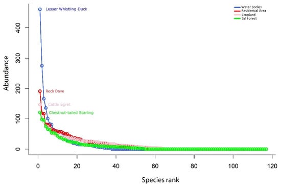 The rank-abundance represents the position of the bird in various habitats; the highest abundance of each bird in each habitat held the top position.