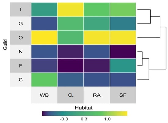 Heat map showing the distribution pattern of various feeding guilds in different habitats; blue color represented low value and yellow indicated higher value. The distribution pattern of bird guilds in various habitats formed two hierarchical clusters; CL: Cropland, RA: Residential Areas, SF: Sal Forest, WB: Waterbodies, I: Insectivore, G: Granivore, O: Omnivore, N: Nectarivore, and C: Carnivore.
