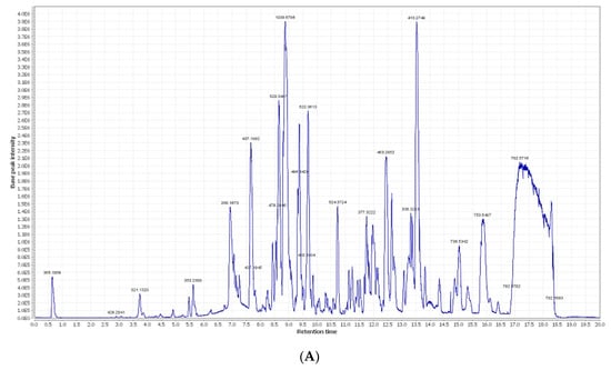 (A) LC-HRESIMS chromatogram of the dereplicated metabolites of Olea europaea L. cv. Picual (positive); (B) LC-HRESIMS chromatogram of the dereplicated metabolites of Olea europaea L. cv. Picual (negative).