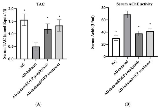 High levels of AChE play a critical role in the deterioration of the cholinergic nervous system and AD progression; thus, several studies target to modulate AChE activities as a therapeutic approach in AD. To evaluate the efficacy of OEP extract in the prophylaxis and treatment of AD, total antioxidant capacity (TAC) and serum and brain AChE activities were examined. As shown in Figure 11, total TAC was significantly (p < 0.001) decreased in AD-induced group to 0.49 ± 0.14 mmol Equiv/L, when compared with the negative control (NC). Meanwhile, in the prophylactic and treated AD-induced groups, total TAC was notably (p < 0.001) elevated to 1.19 ± 0.20 mmol Equiv/L and 1.33 ± 0.22 mmol Equiv/L, respectively, when compared with the AD-induced group. Regarding AChE activity, the serum activity of AChE was evaluated. As shown in Figure 11, serum AChE activity was elevated (p < 0.001) in the AD-induced group to 68.8 ± 5.8 U/mL, when compared with the NC group. After OEP extract prophylaxis and treatment, serum AChE activity was decreased (p < 0.001) to 37.8 ± 4.0 U/mL and 41.8 ± 4.7 U/mL, respectively, when compared with the AD-induced group. Additionally, brain AChE activity was elevated (p < 0.001) in the AD-induced group to 48.3 ± 3.7 U/mL, when compared with the NC group. Meanwhile, after prophylaxis and treatment with OEP extract, brain AChE activity was decreased (p < 0.001) to 33.3 ± 3.2 U/mL and 32.14 ± 3.6 U/mL, respectively, when compared with the AD-induced group, as shown in Figure 11. These findings suggest that prophylactic and treated groups with OEP increased the total antioxidant activities and decreased the serum and brain levels of AChE.
