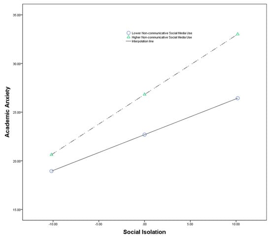 On the one hand, non-communicative social media use regulates the relationship between social isolation and academic anxiety in a positive way. That is, the more undergraduates obtain information about the pandemic through non-communicative social media use, the greater the likelihood of academic anxiety caused by social isolation. This conclusion and existing findings unanimously demonstrate that anxious participants tend to use social media more often to actively search for a way of adapting to the current situation, and to a lesser extent as a way to contact with friends and family []. However, this study found that there is no moderating effect from communicative social media use. The communicative social media use emphasizes communication with family, friends or acquaintances as a way of obtaining information about the pandemic, which may reduce social isolation caused by loneliness and distance, thereby reducing academic anxiety. As Al-Shuhri’s research found, social media use behavior had a positive impact on the social relationships of participants and their friends and family, allowing them to communicate without restrictions and express their views with ease []. Therefore, the differences between communicative and non-communicative social media use in the acquisition of epidemic information when obtaining information on the COVID-19 pandemic need to be further explored.
