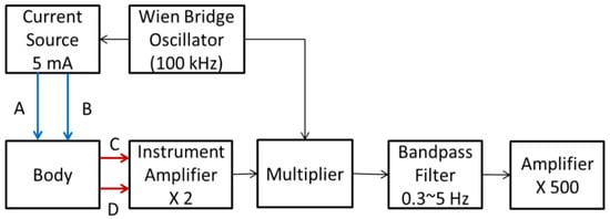 Figure 1 shows the block diagram of the drive circuit for the IPG measurement. A Wien bridge oscillator was used to generate the 100 kHz sinusoidal wave, which drove a constant current source, 5 mA. This radial frequency signal was input to the body by two transmitting electrodes (T1 and T2). An instrument amplifier (AD8422) was used to pick up the modulated signal by two receiving electrodes (R1 and R2). The demodulator was composed of a multiplier (AD9837) and a two-order low pass filter (cutoff frequency: 5 Hz), which extracted the IPG signal. The gain was 500, the cutoff frequency of the four-order low pass filters was 5 Hz to reduce high frequency noise, and the cutoff frequency of the one-order high pass filter was 0.3 Hz to reduce the wounding baseline. The operation amplifier was ADTL082.
