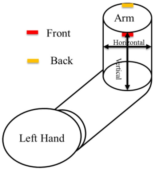The definition for the horizontal and vertical direction on the arm. Red color represents the front side, the yellow-brown color represents the back side.
