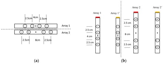 Two different sizes for the electrode array in two directions. (a) There are four electrodes in one array in the horizontal direction; (b) There are eight electrodes in one array in the vertical direction. Four electrodes are on the front side. The other four electrodes are on the back side.