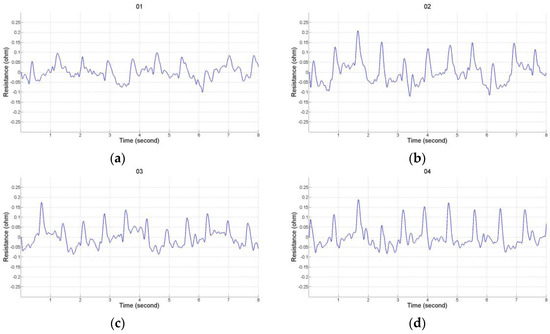 The impedance plethysmography (IPG) technique is a physical measure of the ionic conduction of a specific body segment in contrast with electrical conduction characteristics [,,]. The transient and static values of electrical conductivity depend on the dynamic and balanced conditions of arteriovenous blood volume within a body segment. Thus, it could be used to measure the hemodynamic parameters, such as blood flow, stroke volume, and thoracic fluid. Impedance-cardiography is the most important application [,]. However, the most significant challenge for the IPG technique is the optimal placement of the electrode array, because the current distribution will be affected by body tissue and muscle []. The other problem is how to extract the IPG signal of the blood flow because the resistance of the pulse volume in a segment of an arm is usually from 0.05 to 0.1 ohm []. Moreover, body motions will make the baseline of the IPG signal vary. [].