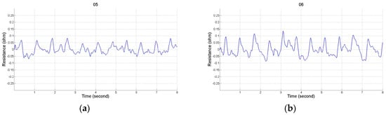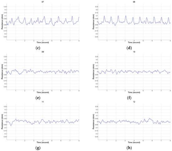 There were 12 placements for the electrode array as shown in Table 1. Numbers 1 to 4 belong to the placement of electrode array in a horizontal direction, and numbers 5 to 8 belong to the placement of electrode array in a vertical direction. Numbers 9 to 12 belong to the types of the mixed electrode array that have two electrodes on the front and back sides. The receiving electrodes are between the transmitting electrodes for the odd numbers, and the receiving electrodes and transmitting electrodes are alternately arranged for the even numbers. Figure 4 shows the IPG signals for one male subject. The electrode array was placed in a horizontal direction from numbers 1 to 4. Figure 5 shows the IPG signal for the same one in Figure 4. The electrode array was placed in a vertical direction from numbers 5 to 12. We found that significant pulses of blood flow could be found in Figure 4a–d and Figure 5a–d. However, the IPG signals in Figure 5e–h could not show clearer pulse signals than in Figure 5a–d. That is, the placements of the electrodes could not mix the vertical and horizontal directions at the same time. Then, the amplitude of ΔZ/Δt was used to evaluate the performance of the electrode arrays (shown in Figure 6). We found that the electrode array placed in a horizontal direction could obtain the best signal-to-noise ratio. Furthermore, the bipolar electrodes must be placed symmetrically for the transmitting electrodes and receiving electrodes. According to the electrode array for number 4, we designed an IPG ring with a width of 3 cm, and the Ag–AgCl spot electrode was used. Figure 7a shows the real photo of the IPG ring, and Figure 7b shows the extension of the IPG ring.