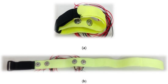 Some wearable techniques for healthcare devices have been developed over the last decade []. There are fingertip pulse oximeters to measure oxygen saturation (SpO2) [], electrocardiography (ECG) [,], and devices to measure body temperature [], physical activity [,], heart rate [,] and respiratory rate []. Some wearable devices with many sensors could measure a few physiological parameters; an ECG, for example, can monitor body temperature, heart rate, motion activity, etc., [,]. Nowadays, these wearable devices can be worn on the chest, wrist, waist, or ankle. Moreover, they could be made as shirts or vests and be worn on the body.