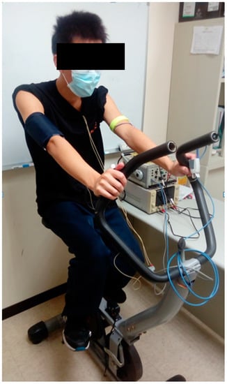 An electronic blood pressure monitor (Omron, HM-7210, Japan) was used to measure their blood pressure, which was used as the accurate blood pressure in this experiment. The blood pressure monitor cuff was tied onto the right arm, the probe of the PPG was placed on the first finger of the left hand, and the IPG ring was placed on the left arm. The electrodes of the ECG were placed on the chest to measure the lead II signal. The subject rode on a fitness bike. Figure 8 shows the real photo of the experiment.