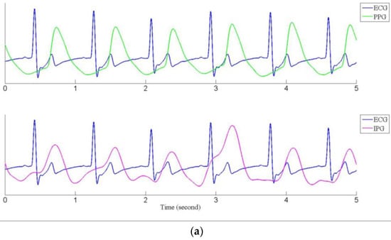 Subjects rested on the fitness bike for about five minutes, then their blood pressure was measured as the baseline. At the same time, the ECG, the PPG, and the IPG signals were recorded for 40 s. Subjects were requested to ride the fitness bike as intensely as possible for about 20 min. Their blood pressure was measured again. If their blood pressure was not higher than 20 mmHg for the baseline blood pressure, they had to ride the fitness bike continuously until their blood pressure measured higher than 20 mmHg. When measuring their blood pressure, the ECG, the PPG, and the IPG signals were measured again for 40 s. Then, the subjects would rest for about 10 min, and were requested to do the experiment again. Figure 9a shows the recorded ECG (blue line) and PPG (green line) signals, and Figure 9b shows the ECG and IPG (purple line) signals before and after riding the fitness bike. We found that the IPG signals were not more stable than the PPG signals. However, the main peaks of the PPG and the IPG were clear and obvious. The main peaks for the IPG signal were sharper than the PPG signal before exercise, especially in Figure 9a.