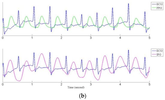 The ECG (blue), PPG (green) and IPG (purple) signals, (a) before exercise; (b) after exercise.