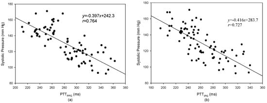 The result of the PTTPPG and systolic pressure. (a) The relation between the PTTPPG and systolic pressure, r = 0.764; (b) The relation between the PTTIPG and systolic pressure, r = 0.727.
