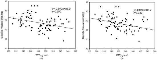 The result of the PTTPPG and diastolic pressure. (a) The relationship between the PTTPPG and diastolic pressure, r = 0.350; (b) The relationship between the PTTIPG and diastolic pressure, r = 0.332.