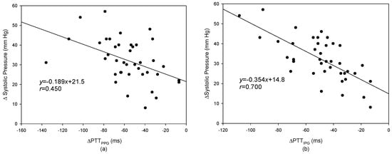 In the clinical application, the changes of the PTT are interesting in a non-invasive beat-to-beat index of blood pressure changes. When the blood pressure is increased by an increase in arterial stiffness, the relationship is nonlinear at high and low pressures []. If the blood pressure is changed by more than 10 mmHg, the PTT accurately tracking the change would drop to 67%. In this study, the systolic pressures after exercise were all more than 20 mmHg. Thus, the results of our study were worse than those of the previous studies [,,,].