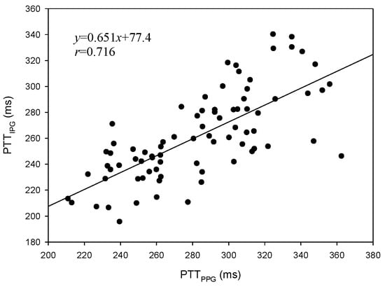 The levels of systolic pressure measured after exercise were significantly higher than before exercise. A linear regression was used to find the relation between the PTT and blood pressure. Figure 10a shows the result of the PTTPPG and systolic pressure, the correlation coefficient is 0.764; Figure 10b shows the result of the PTTIPG and systolic pressure, the correlation coefficient, r, is 0.727. Figure 11a shows the result of the PTTPPG and diastolic pressure, the correlation coefficient is 0.350; Figure 11b shows the result of the PTTIPG and diastolic pressure, the correlation coefficient is 0.332. The results for the change of systolic pressure before and after exercise and the change of the PTT are shown in Figure 12. The correlation coefficient (r = 0.700) for PTTIPG was higher than it was for the PTTPPG (r = 0.450). Figure 13 shows the correlation between the PTTPPG and the PTTIPG (r = 0.716). Although the PPG and IPG all belong to the plethysmograph technique, this result represents that the IPG signal is more sensitive to a change in the PTT than the PPG signal.