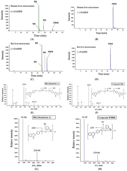 We evaluated the metabolic rate of FD18 using human liver microsomes (HLM) and rat liver microsomes (RLM). Metabolites were identified by comparing the LC-MS (QTOF) chromatograms after incubation with or without NADPH in both HLM (Figure 2A,B) and RLM (Figure 2C,D) systems. Three identical metabolites were detected in both HLM and RLM systems. Metabolites M1, M2 and M3 were identified with a singly charged mass-over-charge ratio of 634 m/z, 416 m/z and 327 m/z, respectively (Figure 2A,C). In both systems, M2 was the most abundant metabolite (Figure 2A,C).