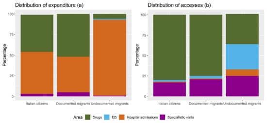 As for the objective of mapping the types of healthcare services exploited and their characteristics, our main output is a graph of the different distributions of the different expenditures (i.e., hospitalisations, pharmaceuticals, specialistic visits, access to ED), which is shown in Figure 1a. While the percentage of costs due to hospital admissions for Italian patients reflects the statistics reported in the literature [], and it is slightly less for documented migrants, the same does not happen for undocumented migrants. The percentage of healthcare expenditure dedicated to hospital admission, in fact, is 51% for Italian citizens and 43% for documented migrants, while it raises to 92% for undocumented migrants. This difference in the expenditure for hospital admissions mirrors the difference occurring in the pharmaceutical expenditure. In fact, the pharmaceutical expenditure accounts for 6% of the total expenditure of undocumented migrants, much less compared to the 45% and 52% of the total expenditure of Italian citizens and documented migrants, respectively.