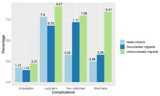 As for the objective of quantifying the preventable hospital admissions, Figure 2 shows the percentage of the hospital costs due to amputations, short term complications, long term complications and non-controlled diabetes. For all these indicators, undocumented migrants show higher percentages, and the p-values confirm the significance of this result for long-term complications (p = 0.0029), short-term complications (p < 0.001) and non-controlled diabetes (p < 0.001), while no significant differences emerge in the case of amputations (p = 0.111).