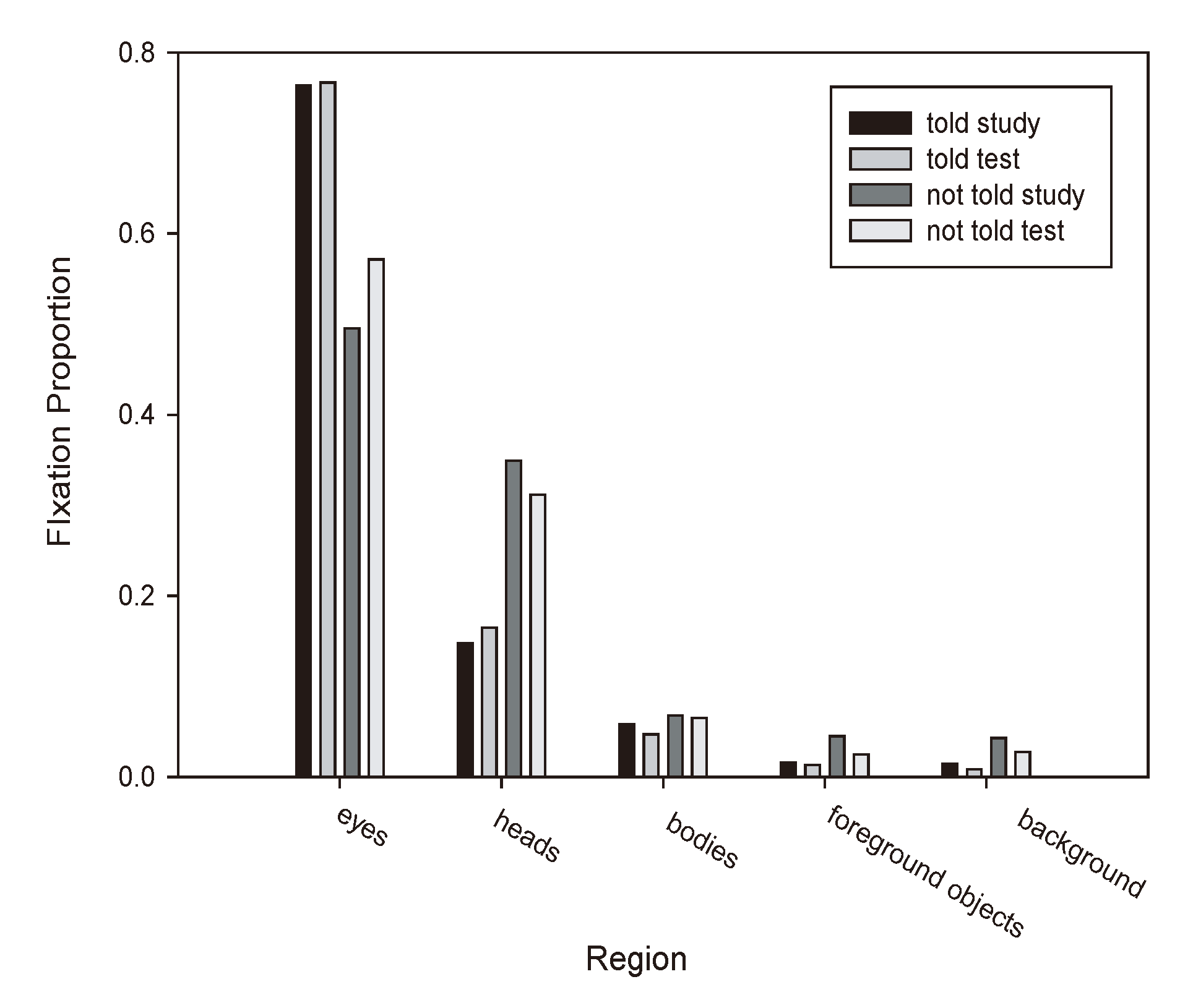 Figure 3) scenes, as a function of Instruction (Told, Not Told), Session (Study, Test), and Region (eyes, heads, bodies, foreground objects, background).