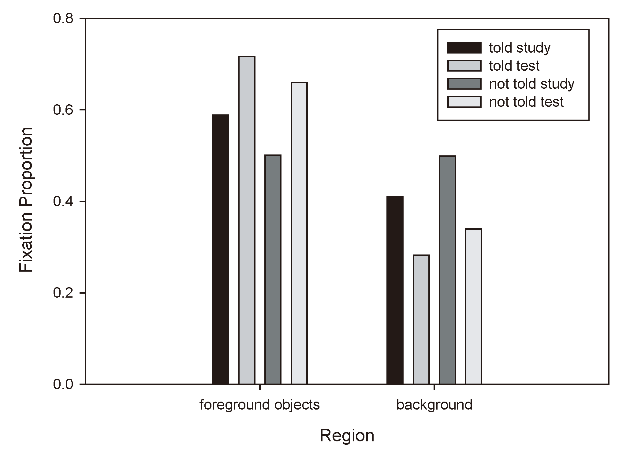 The No People scenes, on the other hand, showed a different pattern. The Told group and the Not Told group had very similar fixation patterns: overall, they both preferentially fixated the foreground objects, and there were no group differences. Thus, it appears as though within the No People scenes, the foreground objects were preferentially fixated as part of a general viewing strategy unrelated to scene encoding. Importantly, both the Told and the Not Told group fixated the foreground objects more, and the background less, in the test session than in the study session. This latter result suggests that the foreground objects were indeed used for retrieving the scenes from memory.