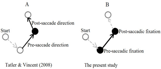 Schematic of a sequence of four fixations, denoted by circles, with arrows representing saccade direction between fixations. The solid black circles and solid arrows are of concern to the two studies shown. Panel A shows that Tatler and Vincent (2008) were concerned about preand post-sacade changes in direction on fixation duration. Panel B shows that the concern of the present study was preand post-saccadic fixation durations with an intervening saccade.