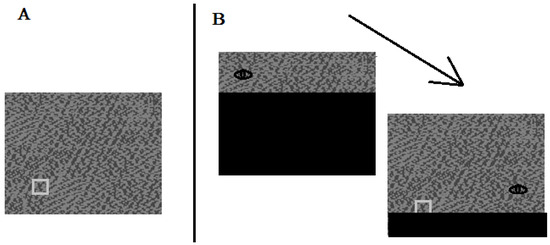 Participants sat about 55 cm from the monitor in a well-lit room (100 Lux). An experimental session started with a 9-point calibration of a head-mounted Eyelink II eye tracker. Eye drift correction was performed before every search trial to maintain a high level of tracking accuracy. A trial consisted of a random dot noise stimulus (e.g., Figure 2A). Observers executed a saccadic search for the target in each stimulus, and terminated the trial with a mouse click response as soon as the target was localized. Each trial consisted of one of three viewing conditions: No Obstruction, Upper Visual Field Obstruction, and Lower Visual Field Obstruction. The obstruction (programmed as a gaze-contingent moving mask that hid everything below or above eye fixation) was located 2.5 degrees above, or below the fixation point. The obstruction followed the observers’ eye position with a delay that was brief enough not to disrupt a seamless perception of the visual stimuli. The target was presented one time at random in each of sixty-eight predefined target locations, for a total of 204 trials per observer (i.e., 68 target locations X 3 viewing conditions).