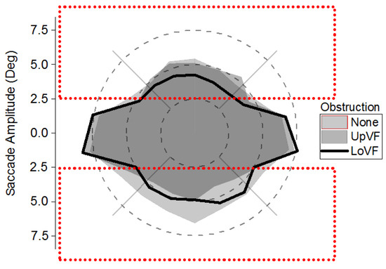 Saccade amplitudes as a function of saccade direction and obstruction condition. The rectangles show visual field obstruction locations in the upper or lower visual field, relative to eye fixation (i.e. 0 deg). Vertical saccades were executed beyond the 2.5 deg near boundaries of obstruction.