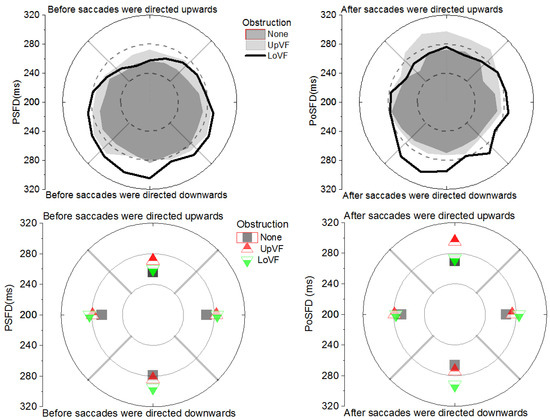 For this paragraph, the reader is directed to the upper quadrants in the two left panels of Figure 4. With the UpVF obstruction, PSFDs for saccades directed upwards (271ms) were longer by 15 ms than PSFDs directed upwards when there was no obstruction (256ms) [t(102) = 4.31, p <.01, d= .58]. The LoVF obstruction had no effect on PSFDs for saccades directed upwards (260ms vs 256ms) [t(102)= 1.13, p > .05, d= .30]. Thus, only the UpVF obstruction increased PSFDs for saccades directed upwards.