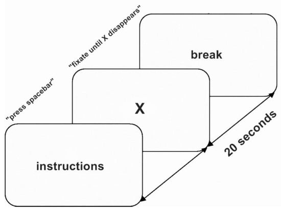 Graphical representation of the sustained fixation task: Participants were instructed to fixate on a white cross appearing on a black screen for 20 seconds. Each trial was followed by a short break.