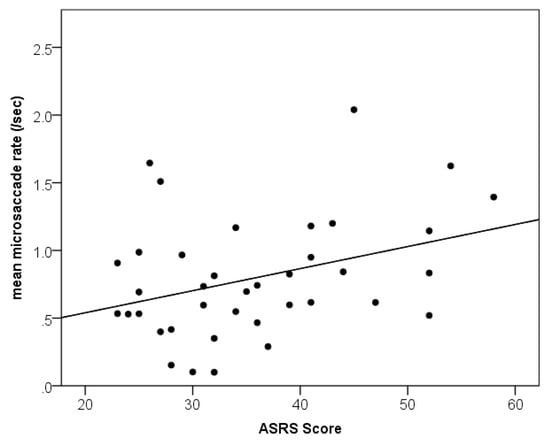 A positive correlation was found between overall ASRS scores and binocular microsaccade rate (Figure 3), r(38)=.35, p=.02. Higher level of ADHD traits was associated with an increased rate microsaccades.