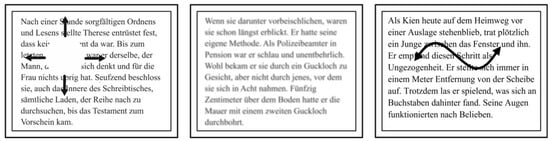 In every block the parameters of the low vision simu-lation were adjusted such that the visual acuity was equally reduced for all participants in all simulations. To achieve this we measured visual acuity with numbers of 14 pixels size, which corresponds to a Snellen visual acuity of about 20/100 in our conditions. We then worsened the low vision conditions stepwise until the participants could not cor-rectly identify at least 8 of 12 numbers within 30 seconds. We then used the parameters of the preceding step for the experiment. The central scotoma was adjusted by making the diameter of the disc bigger. A scotoma (disc) with a diameter of 0.5° was chosen as starting point and was then increased in step sizes of 0.5°. To calibrate the blurred vi-sion, the test started with a blurring radius of one pixel (146” seconds of arc). This radius was then increased in steps of one pixel. In the simulated oscillopsia, we in-creased the frequency of the sinusoidal movement: The in-itial-frequency was 0.4 Hz horizontal and 1.1 Hz vertical. For each step, the horizontal movement was increased by 0.2 Hz and the vertical movement was increased by 0.3 Hz. After the calibration of the eyetracker and the adjustment of the low vision simulation were successfully completed the participants had to read texts in 6 different magnifica-tions and 5 different contrast levels. The german texts were taken out of the novel ‘Die Blendung’ (). Each text passage had a mean length of 55 words (range 48 to 62) and a mean length of 291 characters (range 272 to 309). As font we used Times New Roman. All the texts were distributed over either nine or ten lines, no matter which magnification was used.