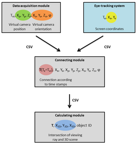 The modular design reduces computational complexi-ty for data acquisition. Data for gaze position and virtual camera position and orientation are recorded inde-pendently. Combining the data and calculating 3D coor-dinates is done in the post-processing phase. Splitting the modules for combining data and calculating 3D coordi-nates allows information from different eye-tracking systems (SMI RED, EyeTribe, generic CSV files) and various types of data (raw data, fixation) to be processed.