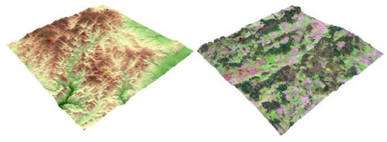 An example of stimuli from variant A – terrain covered with a hypsometric scale (left) and variant B – terrain covered with a satellite image (right).