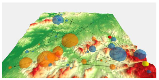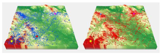 First, we tried to visualize raw data as simple points placed on a 3D surface. This method is very simple, but its main disadvantage is the poor arrangement of depicting data in this way, mainly in areas with a high density of points. The size, color, and transparency of symbols can be set in used GIS software. With this type of visualization, data from different groups of participants can be compared, as shown in Figure 7. Raw data displayed as points were used as input for creating other types of visualizations. Figure shows the 3D visualization of raw data created in QGIS. Visualization of a large number of points in the 3D scene in a web browser through Three.js is hardware de-manding. Thus, visualization of raw data is more effective in ArcScene.