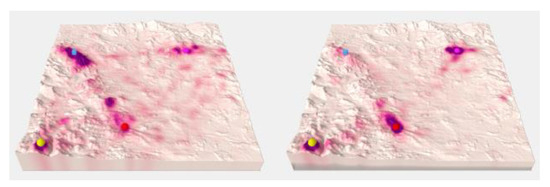 Projected attention maps can be created in the ArcScene environment using the Heatmap plug-in in QGIS function. Heatmap calculates the density of features (in our case fixations) in a neighborhood around those features. Conceptually, a smoothly curved surface is fitted over each point. The important factors for creating Heatmap are grid cell size and search radius. We used a cell size of 25 m (it is about one thousandth of the terrain model size) and search radius as an implicit value (see Figure 9).