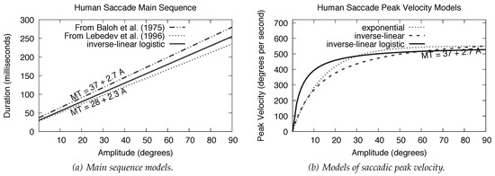 Human saccades are stereotyped (Fuchs, 1967) and presumed to be ballistic (Carpenter, 1977), meaning programmed motor movements whose trajectory is un-changeable once in flight. Saccades follow the main sequence describing the relationship between saccadic peak velocity and amplitude (Bahill, Clark, & Stark, 1975; Baloh et al., 1975; Knox, 2001). The main sequence also relates saccade duration to amplitude. Treating saccade duration as movement time MT, the main sequence can be expressed as a linear relation