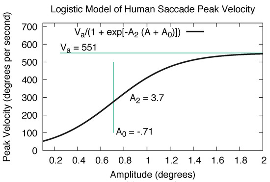 where A denotes saccade amplitude, Va is an asymp-totic maximum of peak velocity (the saturation value, in degrees per second), and A0 is the half-maximum amplitude (in degrees), i.e., the amplitude at which 50% of the peak velocity is reached. Baloh et al. (1975) compare alternative peak velocity models using a power-law equation