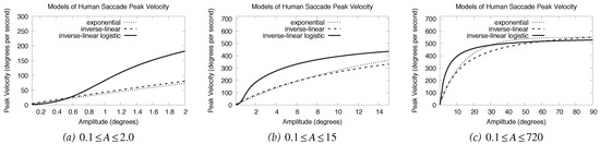 Inverse-linear logistic model of the saccadic main sequence: (a) small-amplitude range; (b) mid-amplitude range; (c) large-amplitude range. Note that these plots are of the same three main sequence models, shown at three different amplitude ranges. The peak velocity range of the small-amplitude plot (a) is reduced to make the inflection point visible (at about 0.7◦ amplitude) which neither of the exponential nor inverse-linear functions can adequately represent.