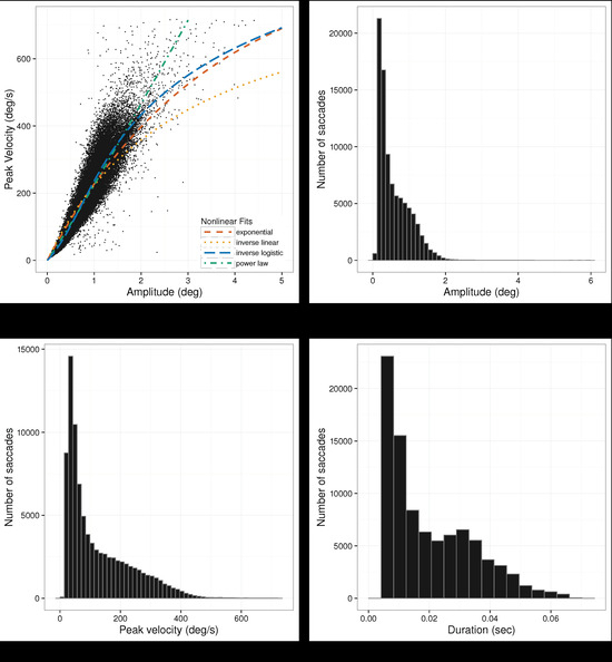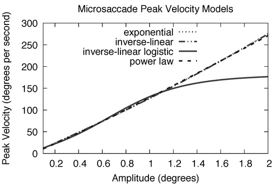 One limitation of our approach involves our “cyclo-pean simplification” wherein we average the left and right gaze points into a single point prior to microsac-cade detection. This averaging may distort the shape of the main sequence. However, our examination of the inverse-linear logistic function was made with the assumption of the suitability of the exponential, power-law, and inverse-linear fits, as has been demonstrated in the past. Because these latter models also fit the main sequence produced by our algorithm, it is likely that whatever distortion may have been introduced, if any, did not unfairly disadvantage the other functions. Still, our choice of algorithmic simplification should be examined with greater scrutiny in future evaluation of the inverse-linear logistic function.