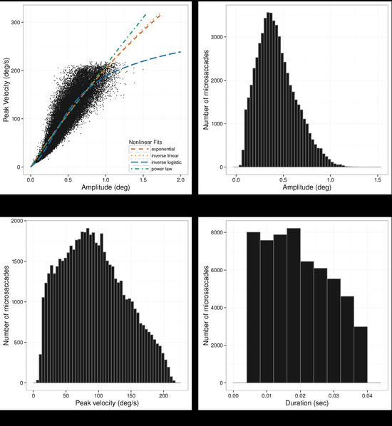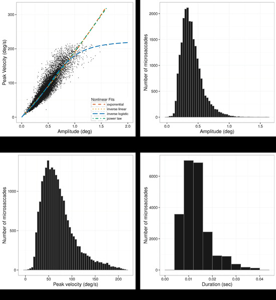 Microsaccadic distributions and the microsaccadic peak velocity vs. amplitude scatterplots are given in Figure 7, Figure 8 and Figure 9 for Experiments 1–3, respectively. Plots of the microsaccadic and saccadic peak velocity-amplitude relation include different functions fit to the data, for comparison with the inverse-linear logistic function fit. These function fits are discussed below.